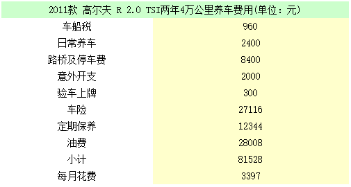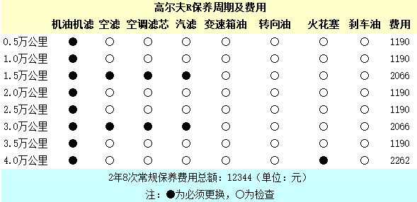 大众进口高尔夫R可以享受由厂家所提供的两年不限公里整车质保。虽然保养手册上标明高尔夫R车型的保养间隔为1.5万公里,但4S店方面表示根据国内的用车环境,高尔夫R的保养间隔必须缩短至5000公里。另外高尔夫R也不提供免费的首次保养,4S店要求新车应该在5000公里以内进行首次保养。 和国产高尔夫1.4T相比,进口高尔夫R的保养成本比较高,其中高尔夫1.4T小保养花费约500元,大保养约1000元;而高尔夫R更换机油机滤的小保养花费约1190元,更换机油四滤的大保养花费约为2066元。由于高尔夫R与尚酷R搭载同款涡轮增压发动机与DSG变速箱,所以这两款车的保养费基本差不多。按照两年行驶4万公里来计算,高尔夫R车型一共需要做8次保养,其花费大概需要1.2万多元。(由于各地区4S店工时费有差别,所以详细费用请以当地4S店实报价为准,以上仅供大家参考) 根据养车费用=车船使用税+日常维护费+过路过桥和停车费+意外开支+上牌费+保险+常规保养费用+油费计算,两年4万公里各项养车支出明细如下: