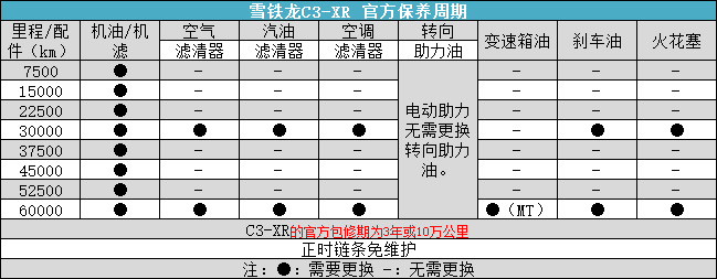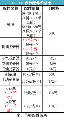 东风雪铁龙C3-XR的三包有效期为2年或5万公里(以先达到者为准),整车质量保修期为3年或10万公里(以先达到者为准),质量保修期从购车发票之日起计算,结束于质量保修期的最后一天。 C3-XR的首次保养在7500公里或6个月(以先达到者为限)进行,首保为免费,更换机油和机油滤芯,并进行相应配件的检查。需要注意的是,厂家要求新车必须在上述指定期限内进行首次保养。 东风雪铁龙C3-XR在各地、各店的4S店工时费都存在着差异,部分店面之间的费用差异还是不小的,但备件价格均为全国统一售价。