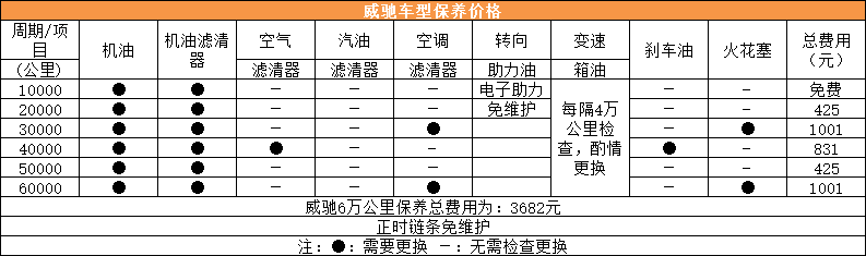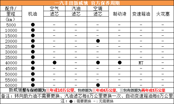丰田威驰整车保修期为三年或10万公里(以先到者为准),易损易耗件的保修期则为自购车发票开具日起6个月或一万公里内(以先到者为准)。蓄电池保修期为两年或5万公里,第一年出现问题可免费更换,第二年则车主要承担50%的费用。 除了常规每5000公里更换的机油和机滤之外,空气滤芯的更换周期为4万公里/次,空调滤芯为2万公里/次,汽油滤芯为8万公里/次,制动液为4万公里/次,手动变速箱油为4万公里/次,自动变速箱油为8万公里/次,火花塞的更换周期为10万公里/次,转向助力油无特殊情况无需更换。 此外,无论何时,车辆只要进行了有偿维修,其更换的新零件保修期限为一年或2万公里(以先到者为准),若在此时间内再次因更换后的同一零件由于质量问题发生的故障即适用零件保修范围。