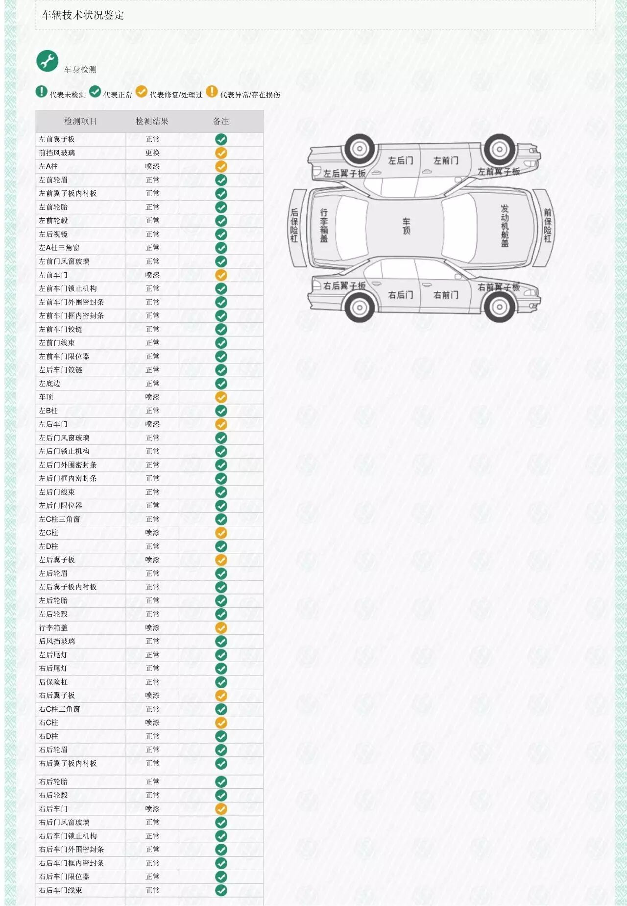 包括外观钣金、车门内框架钣金、发动机舱及后备箱的钣金检查。检查钣金有无变形、凹陷,油漆有无修复,这是判断一辆车是否发生过重大碰撞事故的开始。车身油漆我们用漆膜仪来检测。