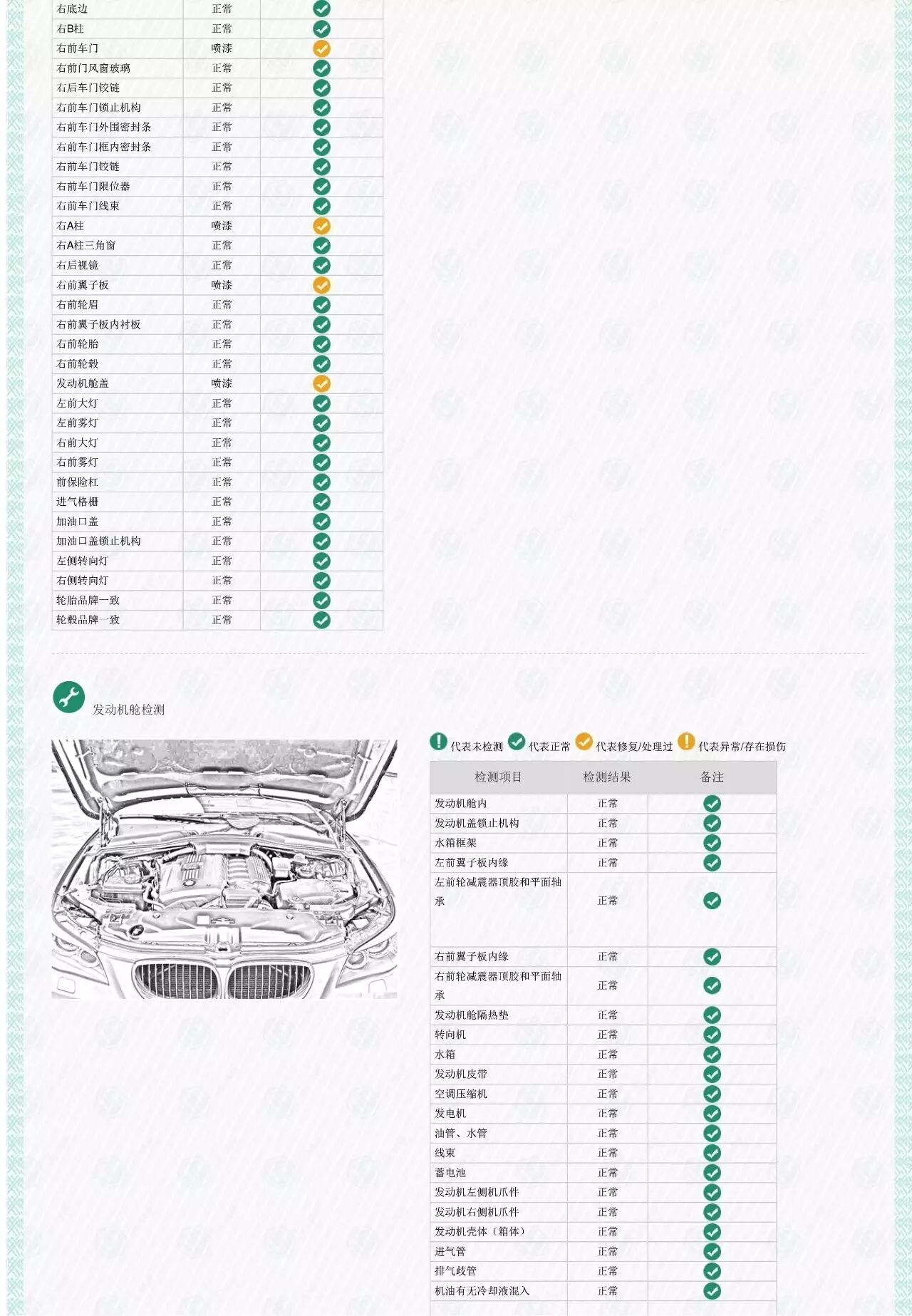 发动机舱和后备箱由于位置特殊,一般用手电筒观察避震塔、水箱框架、纵梁、翼子板内衬,备胎底板,后围,两后翼子板内部。
