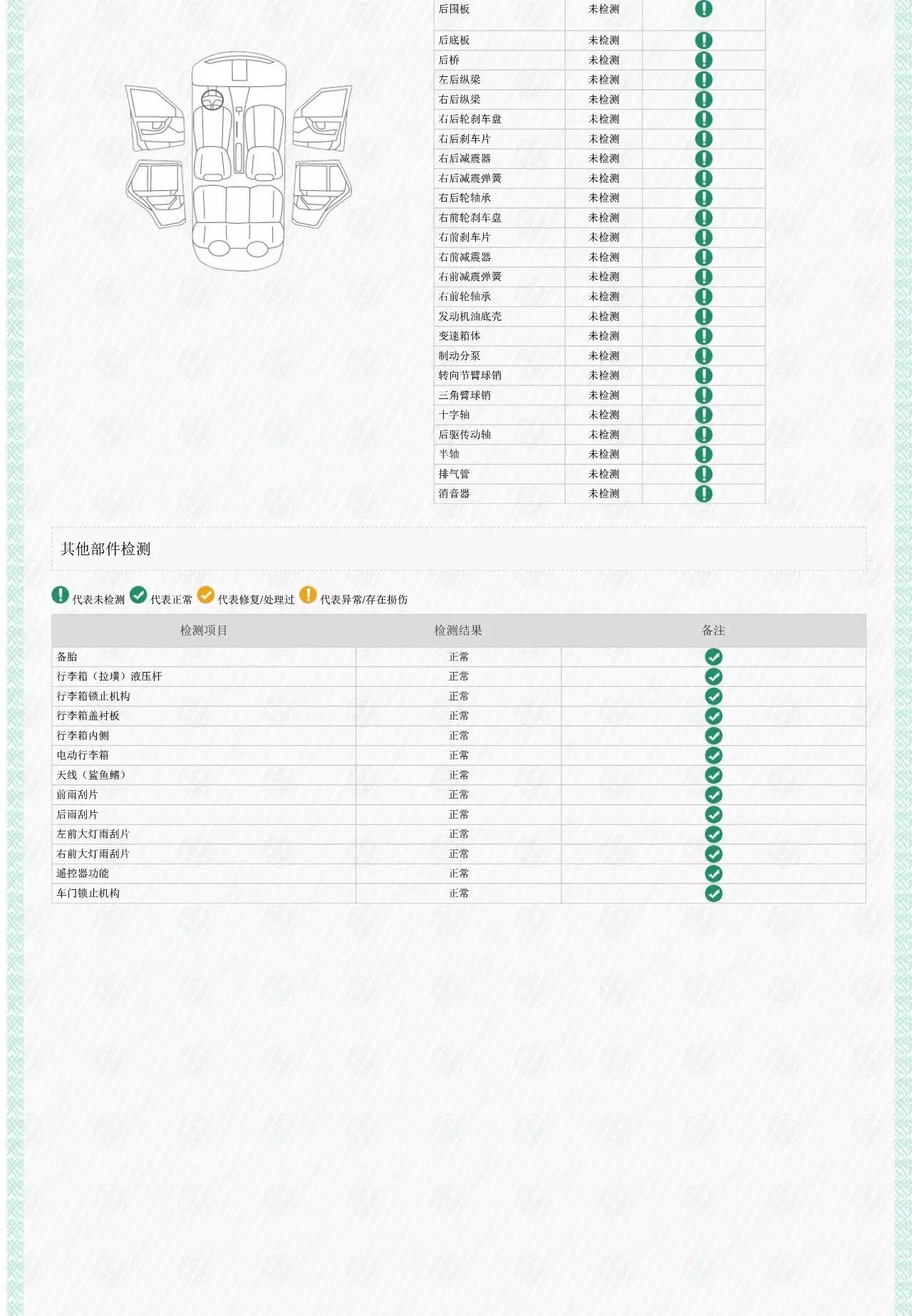 前后底盘检测。在没有举升机的场景下,我们用配合手电就可以检查到底盘全貌。检查避震、制动油管有无漏油,插臂、减震、制动卡钳紧固螺栓是否有变形、腐蚀和不良更换的痕迹等。 经检测,车辆外观喷漆;前风挡玻璃更换。排除了事故车、火烧车、水泡车的可能。(外迁车辆请咨询当地车管所)