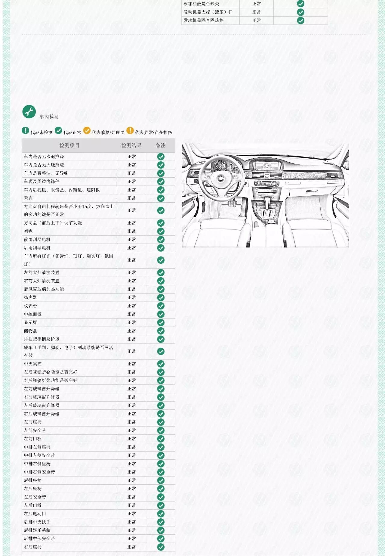 火烧水泡车及事故车的重要检测依据就在此项,检查脚垫下方、安全带底部、车门密封胶条是否存在水渍、泥沙或发霉迹象,检查座椅滑轨是否生锈;座椅及内饰外观、功能是否完好,对磨损程度做出评级等。