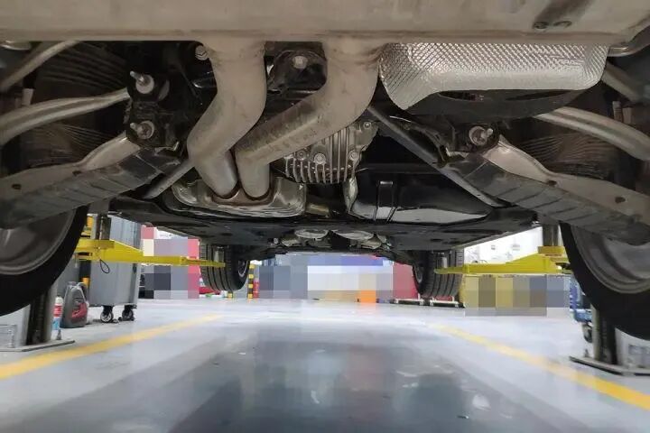 将车使用举升机升起来之后,可以看到发动机油底壳,变速箱油底壳,悬架,副车架,车身的大梁等,这对判断车况是有帮助的。