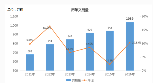 2017年2月7日,中国汽车流通协会发布2016年全年二手车市场情况,数据显示,2016年全年交易量为1039.07万辆,累计同比增长10.33%。从历年交易情况来看,该交易量为二手车市场首次突破千万级大关,并实现两位数增长,实属不易。