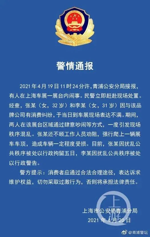 20日早晨,上海警方发布通报称,4月19日11时24分许,青浦公安分局接报,有人在上海车展一展台内闹事。民警立即赶赴现场处置。经查,张某(女,32岁)和李某(女,31岁)因与该品牌公司有消费纠纷,于当日到车展现场表达不满。期间,两人在该展台区域通过肆意吵闹等方式,一度引发现场秩序混乱。张某还不顾工作人员劝阻,强行爬上一辆展车车顶,造成车辆一定程度受损。目前,张某因扰乱公共秩序被处以行政拘留五日,李某因扰乱公共秩序被处以行政警告。